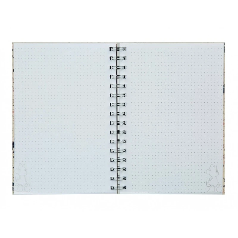 Este cuaderno de Minnie Mouse pertenece a la colección Disney 100 Aniversario y se compone de 80 hojas de tamaño A5 fabricadas en papel FSC de 80 g/m² con plata/oro rosa en el lateral. La encuadernación es de tipo wire-o con doble espiral metálica.