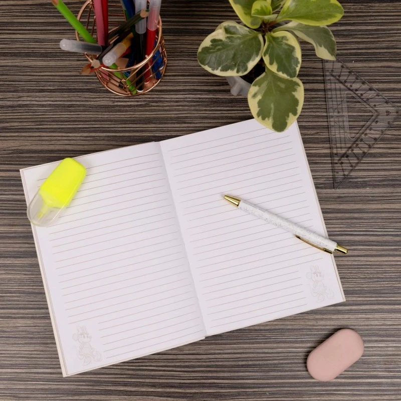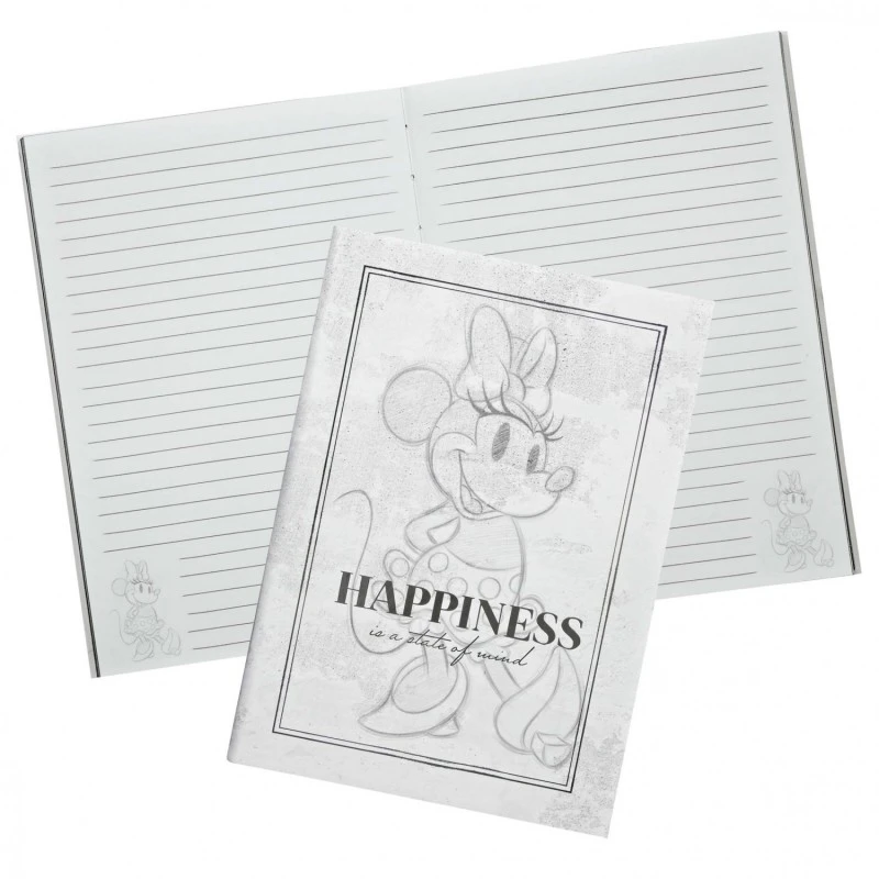 Este cuaderno de Minnie Mouse pertenece a la colección Disney 100 Aniversario y se compone de 80 hojas de tamaño A5 fabricadas en papel FSC de 80 g/m² con plata/oro rosa en el lateral.