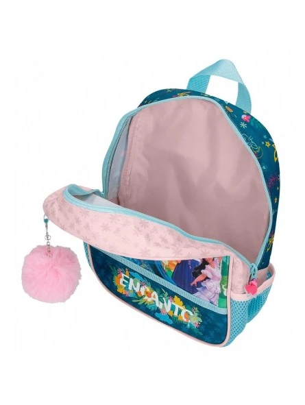 Mochila de 23x28x10 cm. fabricada en microfibra. dos bolsillos laterales de red para guardar una botellita de agua.